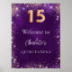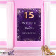 A welcome poster for a girly and glamourous Quinceanera, 15th birthday party. A deep purple background decorated with faux glitter, sparkles. The purple colour is uneven. Personalize and a name.