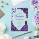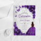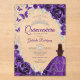 Purple silver and white Quinceanera celebration invitation. Features brunette girl in ball gown dress, script font, silver butterflies, watercolor roses and tiara. Perfect for an elegant princess style glam celebration. Personalize with your own details. Stylish transparent or frosted acrylic invitations.