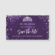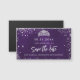 A glamourous Save the Date magnetic card for a Quinceañera, 15th birthday party. A purple uneven coloured background. Decorated with faux silver glitter sparkles and a tiara. The text: Save the Date is written with a large trendy hand lettered style script.