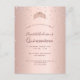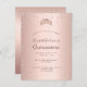 A modern, stylish and glamourous invitation for a girl's Quinceañera, 15th birthday party. A faux rose gold metallic looking background decorated with rose gold faux diamond sprinkle and a tiara, crown. The name is written with a modern dark rose gold coloured hand lettered style script. Templates for your party details.