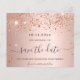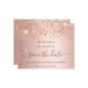 A girly and trendy Save the Date card for a Quinceañera, 15th birthday party. A feminine pink, rose gold faux metallic looking background decorated with faux rose gold glitter dust. Personalize and add a date and name/age. Dark rose gold coloured letters. The text: Save the Date is written with a large trendy hand lettered style script.
