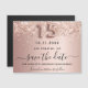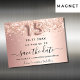 A Save the Date magnet for a Quinceañera. A rose gold background decorated with rose gold faux glitter, sparkles. Personalize and add a date and name/age. The text: Save the Date is written with a large trendy hand lettered style script with swashes.