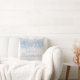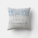 A pillow for a Quinceañera, 15th years old girls room. A faux silver metallic looking background with blue faux glitter drops, spots. The text: Quinceañera is written in blue with a large modern hand lettered style script. Personalize and add a name.