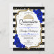 Features stripes, script font, royal blue roses, tiara and confetti. Classy sapphire blue design with faux glitter gold. Perfect for an elegant glam celebration.