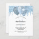 A white background. Decorated with light blue faux glitter drips, paint dripping look and balloons. Personalize and a name and party details.