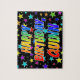 This fun and vibrant birthday-themed jigsaw puzzle design has the message "HAPPY BIRTHDAY, QUINN" with the characters having a colourful rainbow spectrum inspired gradient pattern, along with a lively field of stars background pattern. A colourful puzzle like this might be a fun way to send birthday greetings to somebody named Quinn. [~Z0000468]