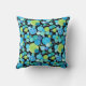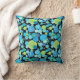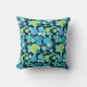 A stylish Cushion or Throw Pillow, with a quirky 'Blue Moons' pattern in bright blues and neon green on a black background; from a handpainted paper collage design by Judy Adamson. Part of the Posh & Painterly 'Blue Moons' range.