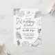 Set the tone for a quirky and whimsical bachelorette party with this black and white tropical beach or pool themed invitation. The design features hand drawn illustrations of palm and monstera leaves, a beach chair, cocktails, a bikini, a sun hat, and sunglasses, creating a playful and unique vibe.
