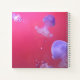 Artistic photograph of purple jellyfish floating in luminous pink water.
