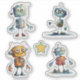 Set of 4 vinyl stickers, quirky robot designs 9 - 12. Perfect for party favours, stocking stuffers, classroom prizes, or scrapbooking. Can be cut into 4 individual stickers, as desired.
