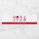 This graduation water bottle label offers the text that appears in a funky type style with a mortarboard sitting on top of the 0 and a stripe of red at the bottom. The text reads: 2023 graduate. Custom text allows personalize the label with the graduates name.