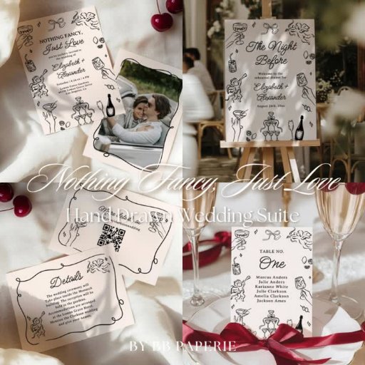 This playful and romantic wedding stationery set brings a lighthearted charm to your big day. The "Nothing Fancy, Just Love – Quirky & Whimsical" theme features hand-drawn illustrations of clinking glasses, dancing figures, and champagne toasts — all in a fun, sketch-style line art. With its casual elegance and a touch of humour, this paper good captures the vibe of couples who want something laid-back, full of personality, and totally them. Perfect for modern celebrations that are more about love than tradition.