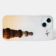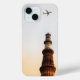 The image displays an iPhone case featuring a graphic of the Qutub Minar, a historic minaret in Delhi, India, under a sky with an airplane flying overhead. The Qutub Minar is depicted in a brownish-red hue, showcasing its intricate architectural details, while the airplane is a small, silhouetted figure against the light sky. The overall appearance is that of a protective case for an iPhone, with the featured image printed on its back.