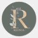 Letter R monogram floral. Letter R in golden brown texture accented with green watercolor compound leaves, flower blossoms and gold dust. Personalized with name in matching font.
