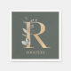 Letter R monogram floral. Letter R in golden brown texture accented with green watercolor compound leaves, flower blossoms and gold dust. Personalized with name in matching font.