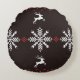 Cozy up for the holidays with this charming round throw pillow! Featuring a classic Fair Isle or Christmas sweater pattern, the design showcases rows of jumping reindeer and large snowflakes in a clean, festive color combination of dark charcoal/black, crisp white, and bold red accents.