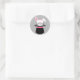 Un autocollant avec l'illustration d'un lapin qui regarde à l'extérieur d'un tophat avec un arc rose sur la tête. Recherchez les invitations d'anniversaire à Jill's Paperie.