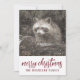 Raccoon in winter snow, holiday Christmas card. Add your family name. Wilderness woodlands style.