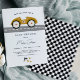 Race car baby shower invitation in a minimalist style with a gold yellow race car and cars pattern on back. You can personalize this invitation with your own details under the "Personalize this template" section.
