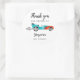 Cute race car theme birthday party favour sticker featuring illustration of blue vintage car with red flame. The text says "thank you for racing by."