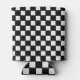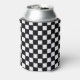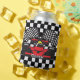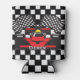Red Race Car on Black and White Chequered Background Can Cooler with customizable text.