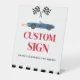 Sign for a child's second birthday party with a racing car motif and a depiction of a blue automobile with flames. "cstom sign," according to the paragraph.
