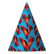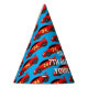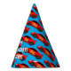 Race car theme kid's Birthday party paper cone hats. Cute pattern with automotive design. Blue or custom background colour. Personalize with text optionally. Change the quantity the get the cheap bulk price. Cool red toy race car pattern.