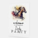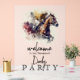 Élégant panneau de bienvenue ACRYLIC derby party présente une aquarelle illustrant une course de chevaux et de jockey vers la ligne d'arrivée et vos détails en lettres chic. CORRESPONDANCE d'objets dans notre collection.