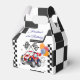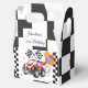Send your little racers home with these fun and festive racing theme favour boxes! Featuring a bold red, blue, and white race car, colourful balloons, and a classic black and white chequered flag border, these boxes are perfect for holding treats, small toys, or party favours.