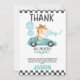 Voiture de course Giraffe Anniversaire Carte de remerciements mignonne petit garçon de course à thème d'anniversaire de voiture de course avec une voiture de course bleue, girafe mignonne, ballons bleus et drapeaux. Ce carte de remerciements de voiture de course comporte également un motif à carreaux noir et blanc et un texte de calligraphie moderne. Une excellente façon de remercier les invités d'être venus à la fête d'anniversaire de votre petit garçon à la voiture de course.