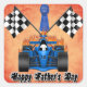 Features a fiery orange gradient background, a blue race car with flames coming off the tires, black and white chequered racing flags, and a blue ribbon that says Worlds Best Father. Stylized text is Happy Father's Day. Perfect gift for Dad this Father's Day. This design was created using original artwork© www.delightful-doodles.com