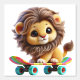 This image features an adorable lion cub with a flowing mane, perched confidently on a brightly coloured skateboard. Its large, expressive eyes and gentle smile exude a sense of playful charm. The vibrant rainbow stripes of the skateboard add to the overall cheerful and whimsical feel of the image. A cute, fluffy lion cub with a full, soft mane, riding on a colourful skateboard. The lion cub has a joyful expression, with big, expressive eyes