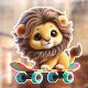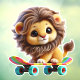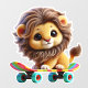 This image features an adorable lion cub with a flowing mane, perched confidently on a brightly coloured skateboard. Its large, expressive eyes and gentle smile exude a sense of playful charm. The vibrant rainbow stripes of the skateboard add to the overall cheerful and whimsical feel of the image. A cute, fluffy lion cub with a full, soft mane, riding on a colourful skateboard. The lion cub has a joyful expression, with big, expressive eyes