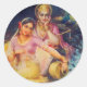 Vintage calendar image of Radha and Krishna in a romantic mood with a waterfall and peacocks in the background
