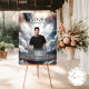 Honor your loved one with this striking funeral welcome sign. Featuring a radiant angel ascending a heavenly staircase, bathed in divine light and surrounded by ethereal clouds, perfect for a serene and heartfelt memorial tribute.