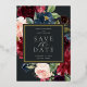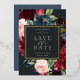 Our Radiant Bloom wedding save the date frames your wedding details with an elegant square border of lush watercolor foliage and flowers in blush pink, burgundy plum and dusty blue, with real gold foil trim on a rich charcoal background.