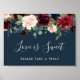 Designed to match our Radiant Bloom wedding collection, this elegant watercolor floral sign welcomes guests to your dessert table or candy bar. Personalize with two lines of custom text in calligraphy and block lettering (shown with "Love is sweet, please take a treat"), framed by lush jewel toned flowers and green botanical foliage on a rich navy blue background.