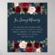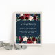 Designed to match our Radiant Bloom wedding collection, this elegant botanical sign is perfect for placing at a memorial table or display honouring loved ones who have passed. Personalize the header and body text (shown with "In Loving Memory" and a brief poem) framed by lush jewel tone watercolor flowers and foliage on a rich navy blue background.