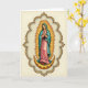 This design shows a serene woman centered inside an ornate, flowing frame, her head slightly bowed and her hands gently pressed together as if in quiet reflection. She wears a soft rose-pink gown with a deep teal cloak draped over her shoulders, the folds falling in a way that feels tender and intimate, like a calm moment shared with a close friend. Behind her, a golden halo of radiating rays surrounds her silhouette, casting a warm glow into the creamy background and drawing the eye inward. Along the upper curve of the frame, small lettering in muted gold sits neatly above her head, while a shorter line of text appears near the bottom in a matching tone. Beneath her feet rests a gilded crescent decorated with delicate floral motifs, suggesting a gentle, dreamy setting 🌷. Tucked into the inner curve of the crescent are a few tiny red berries, adding a quiet pop of color 🐇. The border details curl like vines around the scene, with gold accents tracing the frame and echoing the floral patterns on the crescent. The teal cloak edges are highlighted with fine gold lines that catch the light against the warm cream backdrop.