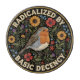 The bold text “RADICALIZED BY BASIC DECENCY” is a witty, sarcastic, and deeply resonant statement for anyone who believes that compassion, empathy, and doing the right thing shouldn’t be radical — yet somehow are.