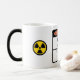 Radiation warning sign with a description below and two nuclear signs on each side.