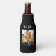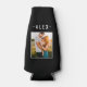 Porte-bières modèle photo personnalisé sur noir avec cadre blanc fin et texte de nom personnalisé.