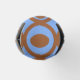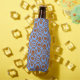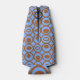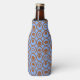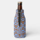 Ce glacière de bouteille a un design géométrique de cercles en rangs avec des cercles ou ovales à l'intérieur en marron sur un champ de bleu.