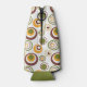 Ce glacière de bouteille a un design moderne du milieu du siècle de cercles concentriques en vert, orange et marron sur un arrière - plan blanc.