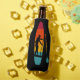 Créez un cadeau personnalisé qui est parfait pour les planchistes debout. Cette enveloppe de bouteille ou d'emballage de bouteille présente une illustration d'un SUP ou d'une planche à pédales debout et d'une pagaie dépeinte en couleurs vibrantes du coucher du soleil avec une illustration en silhouette en noir de quelqu'un embarquant à la pagaie. Le graphique est positionné sur un arrière - plan noir avec un point à l'arrière pour ajouter un nom en lettres jaunes.