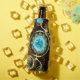 Turquoise lenses with antique watch with brass gears and golden keys on rusty, brown background. Steampunk style.