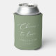 Mariage ou fiançailles branché peut refroidir avec "cheers to love" en blanc police de calligraphie moderne sur un arrière - plan vert sage. Personnalisez avec vos noms et votre date de mariage en dessous.