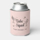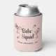 Garde des canettes roses pour votre EVJF avec des illustrations de filles de fête prenant un bain de soleil dans des verres à cocktail, des étoiles scintillantes rétro, "Babe Squad" dans un script rétro et l'emplacement de votre fête ou autre texte en typographie simple.