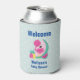 Bienvenue, événement personnalisé, peut cozie. Conçu avec une jolie illustration d'un flamant rose avec quelques pastèques et ananas. Couleurs rose et vert. L'été et tropical. L'arrière - plan est de couleur vert pâle avec des pois blancs.