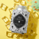 Élégant damas floral noir délicat sur cercle blanc arrière - plan et noir-argent avec coeur argenté - 25e anniversaire mariage. Personnalisable peut refroidir modèle